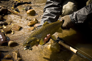 Looking at the small fast water stream its hard to believe that there are large fish up here. But to those who know this gem, its hard to land them. The larger fish turn and run down stream through rocks, snags ans pools. More often than not I never land them. But I get to observe them feeding and doing whatever fish do before they take my fly. My heart is always racing before I cast to the 16" trophy, it skips a beat when I hook into it and bursts when I loose it. Although some dandy fish were hooked, none of the bruisers were landed. Although, twice the fish that broke us off was landed. This happened to Chris first then a bend later it happened to me. I had been fishing a Red Grand Hopper lately with good success and dropped a bead head off it. The fish took my dropper and snapped me off faster than.. well, I don't know.. it was just fast. Then I noticed my red hopper "swimming" upstream and holding in a shallow seam. I walked over and the hopper moved upstream again. Sweet! As I reached down to grab the fly I thought about the hook and how I was going to grab it quickly and hold on tight without getting hooked. I slowly moved my hand to the fly and felt the foam and tried to pinch it on the side. The fish took off and moved between a rock and a hard place... perfect! In my mind I said screw it and just went for it, lucky I got a good hold of the fly and far away from the hook. Miraculously, I landed the fish. I laughed out loud for I don't know how long, what a hoot! This small fat fish has left a lasting impression in my mind, I will forever remember that little guy.... and the beast MFRW lost, er, broke off, would loved to have seen that beauty.